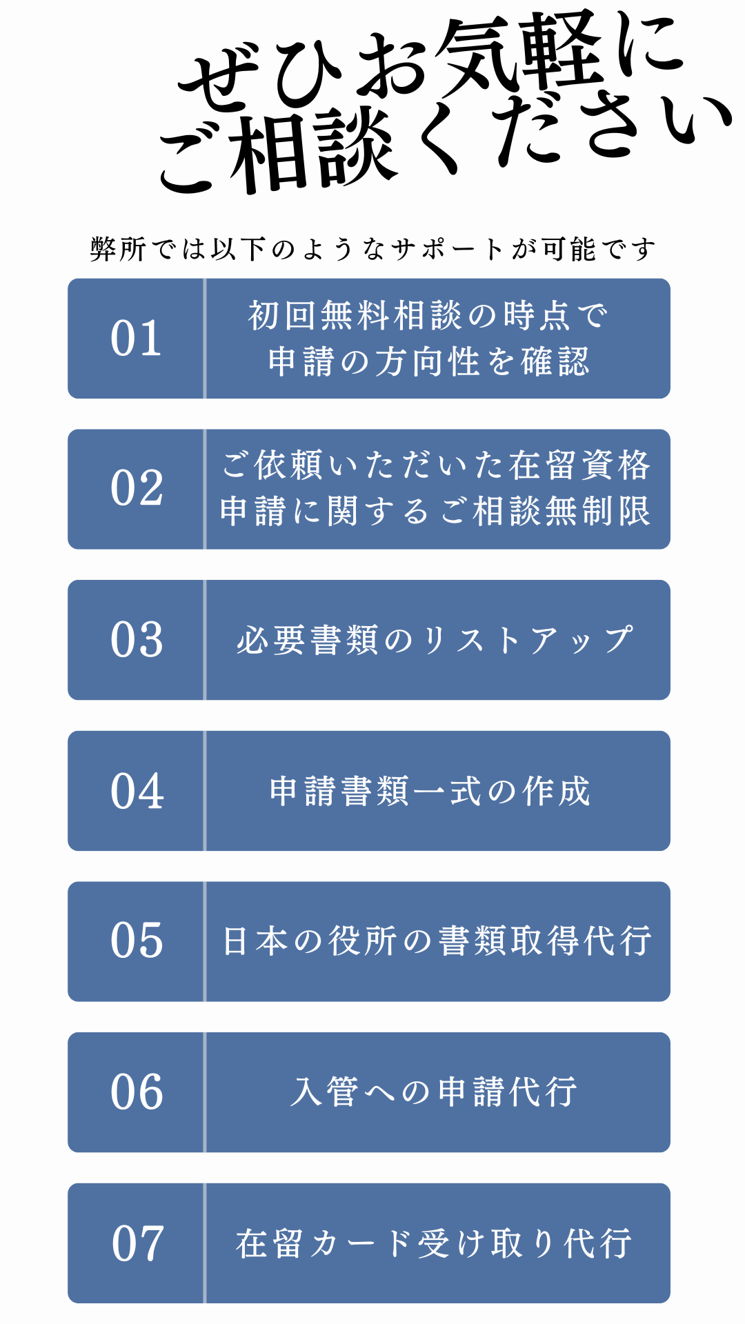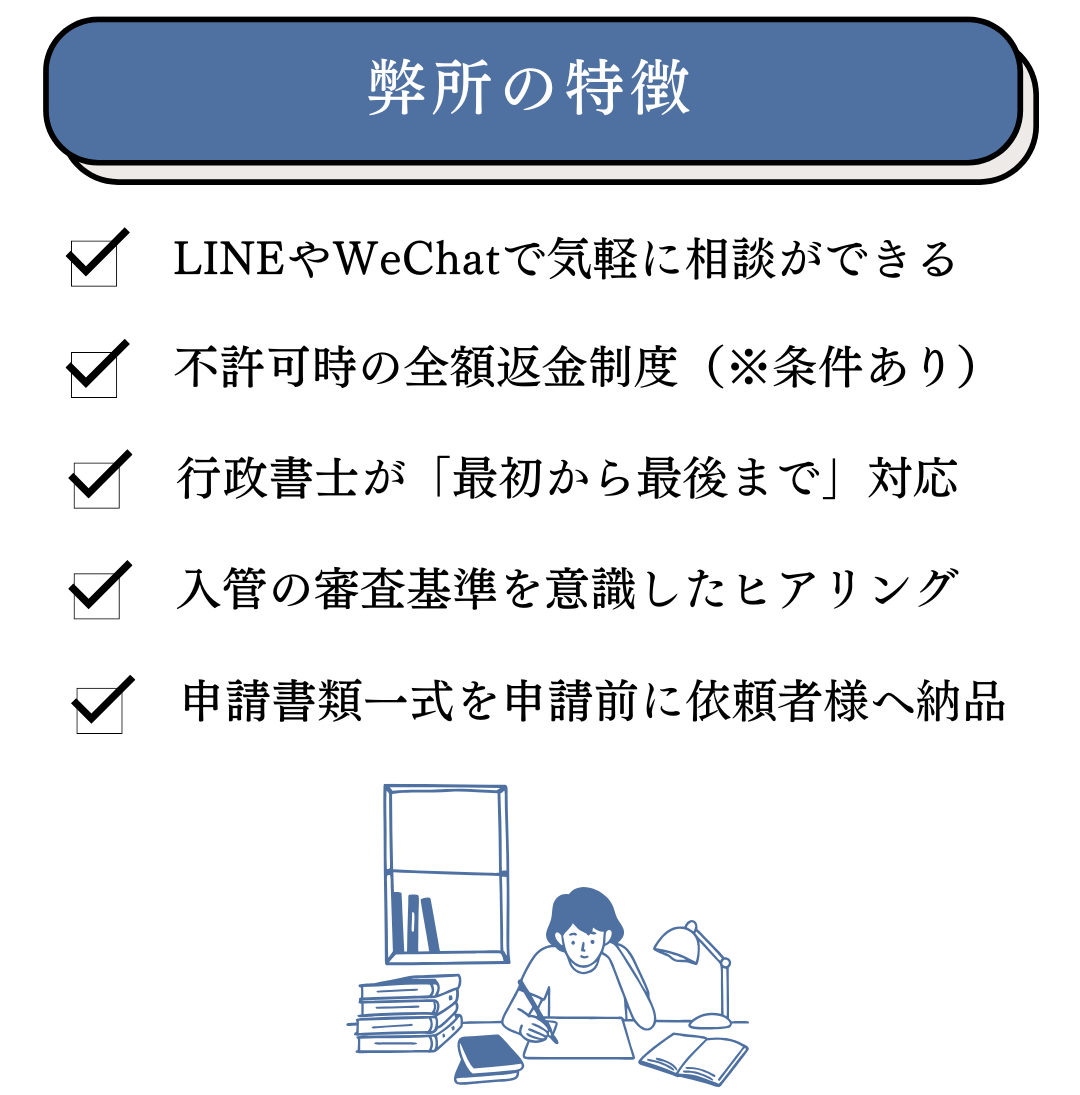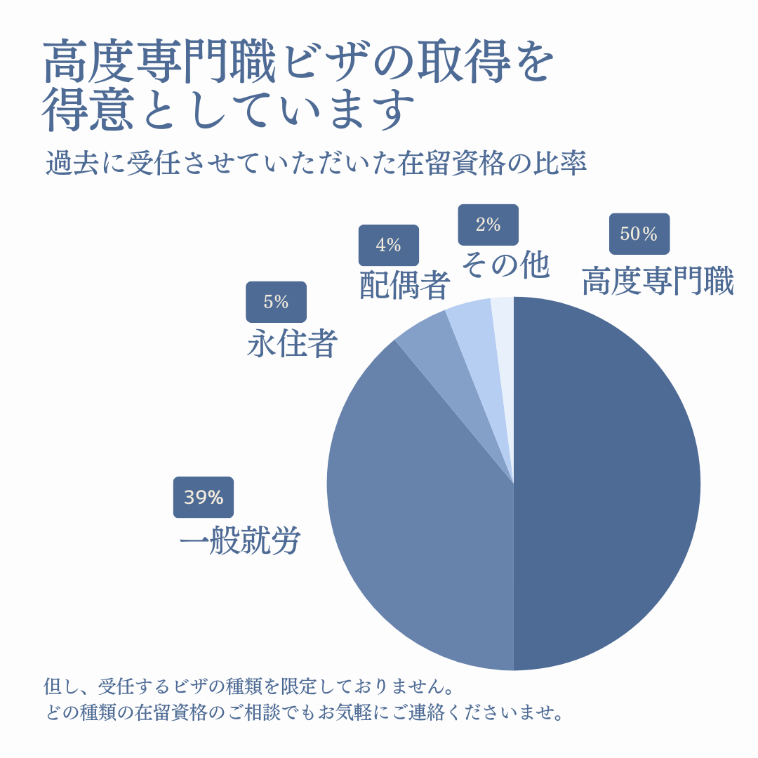 「高度専門職」「経営・管理」「技術・人文知識・国際業務」の在留資格に豊富な経験あり。